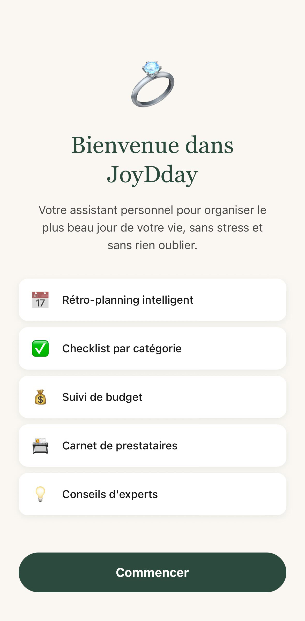 JoyDday vous guide de la demande en mariage jusqu'au grand jour. Rétro-planning, budget, invités, prestataires — tout en une seule app, et sans compte à créer.